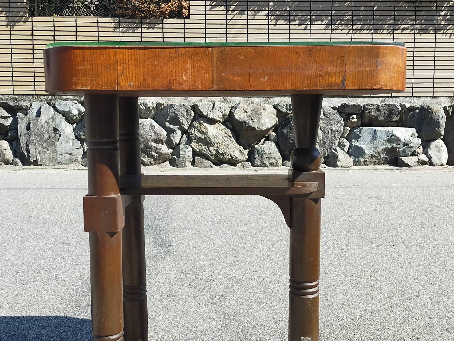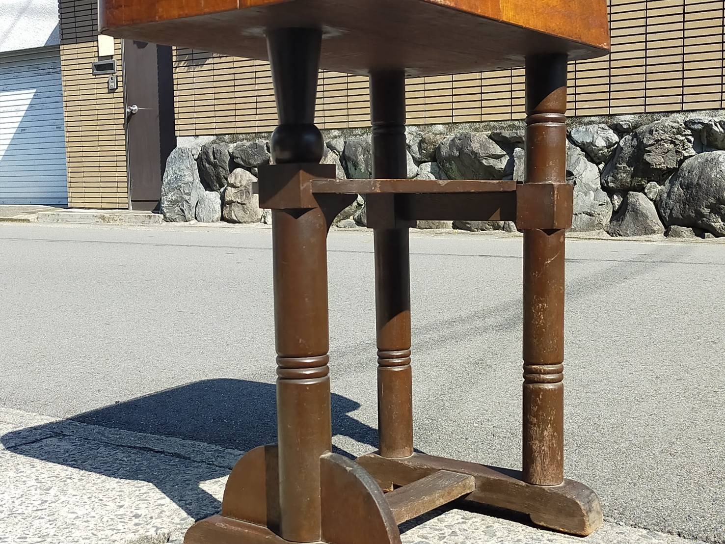 木の天板の上にガラスの板が乗っていますが、木の天板が反っているので、真ん中が若干浮いてます。