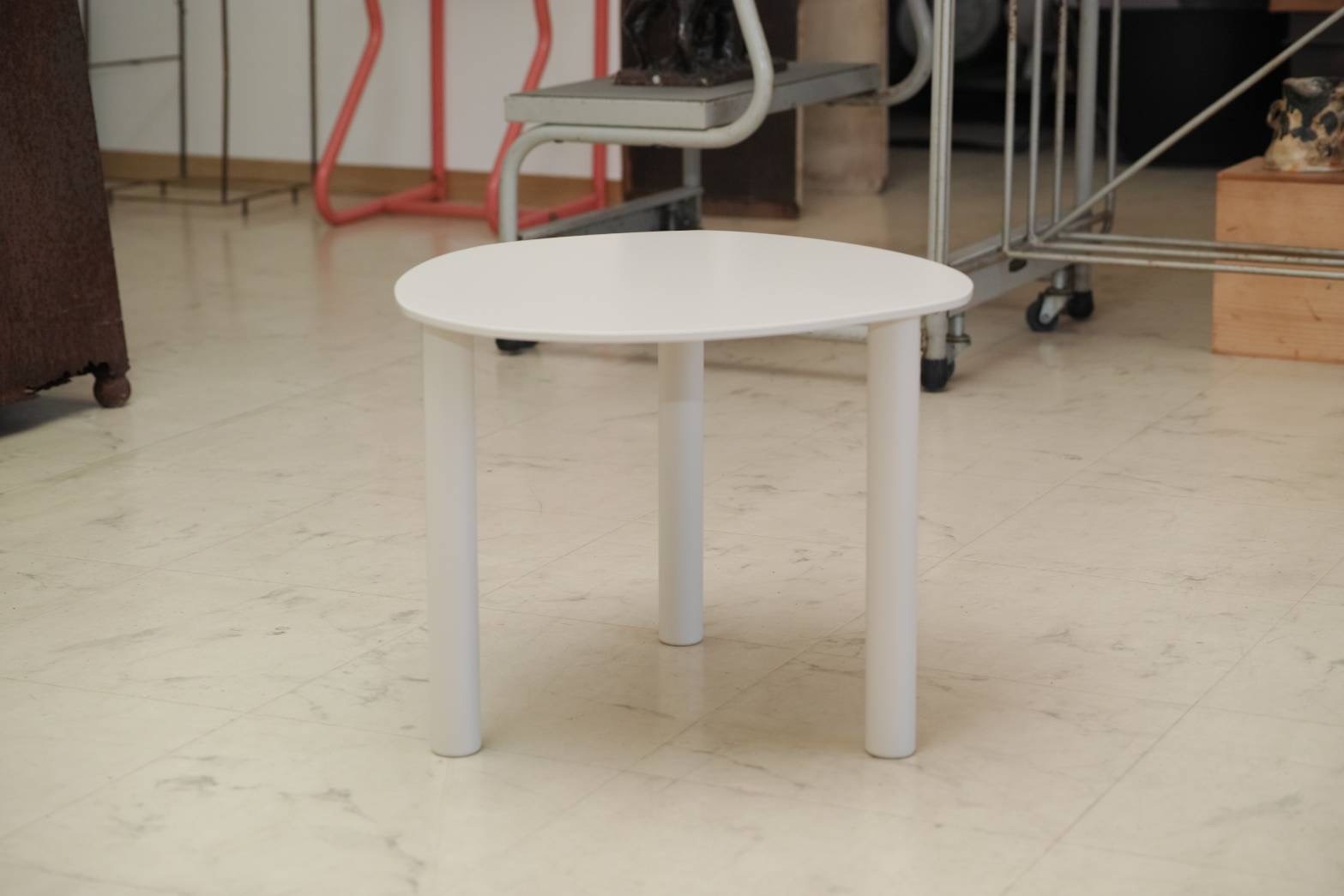 フローリングにポツンはかなり良さそう。棚の横とかに並べて置くのも棚の四角と良い対比になってF卓の曲線を楽しめるかと。