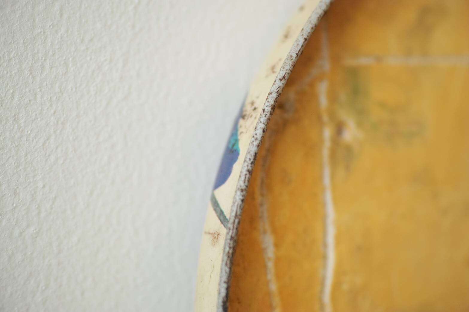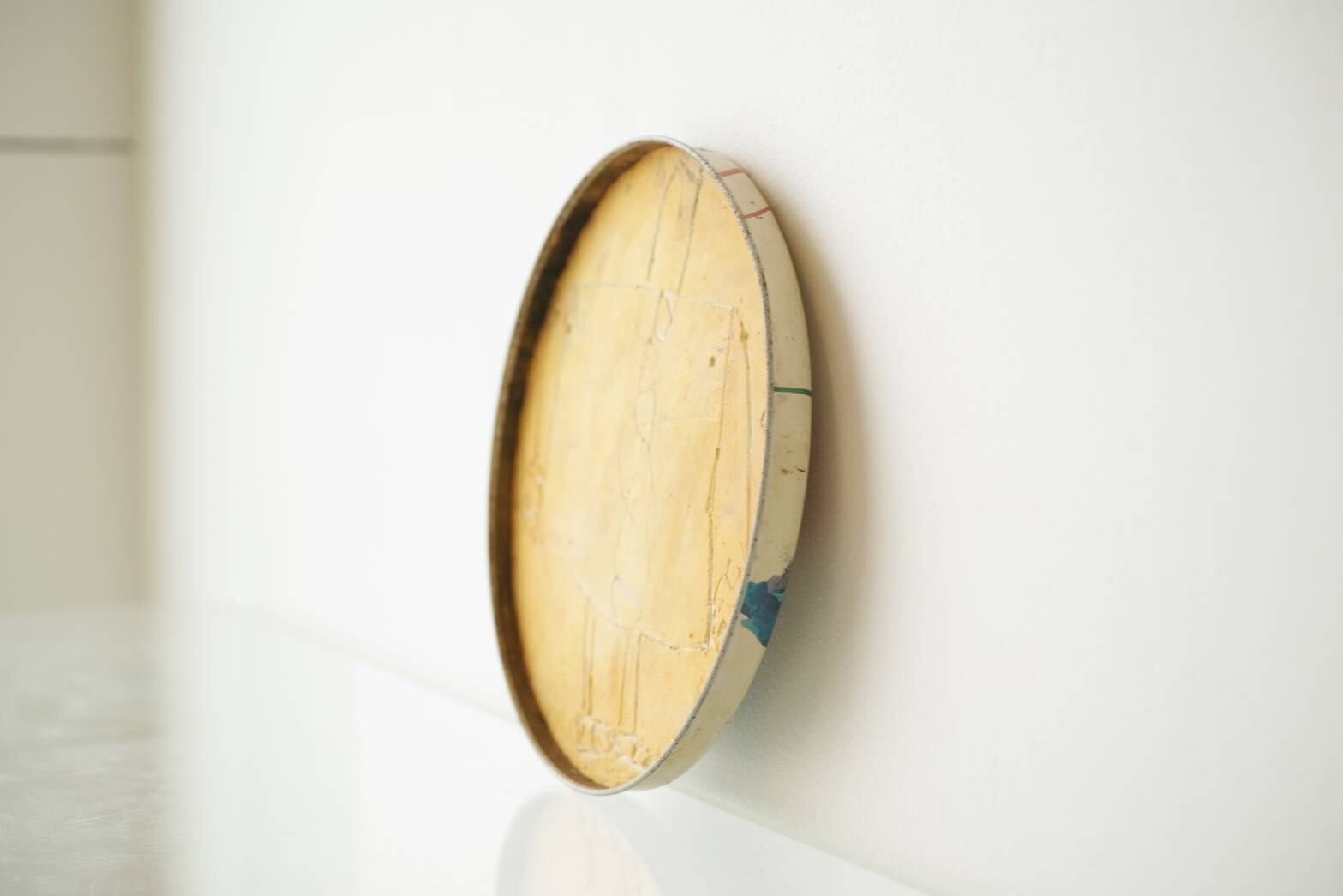 お菓子缶の蓋に流し込んだ石膏を黄色で着色し、削って描かれた作品。