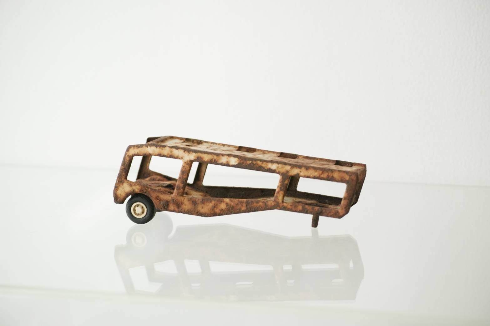 後輪は無くなり、ボロボロに錆びた車のオブジェ。