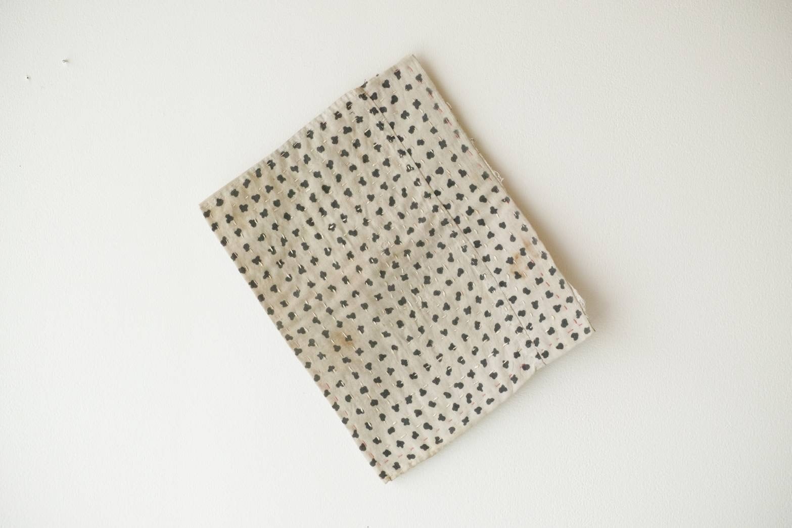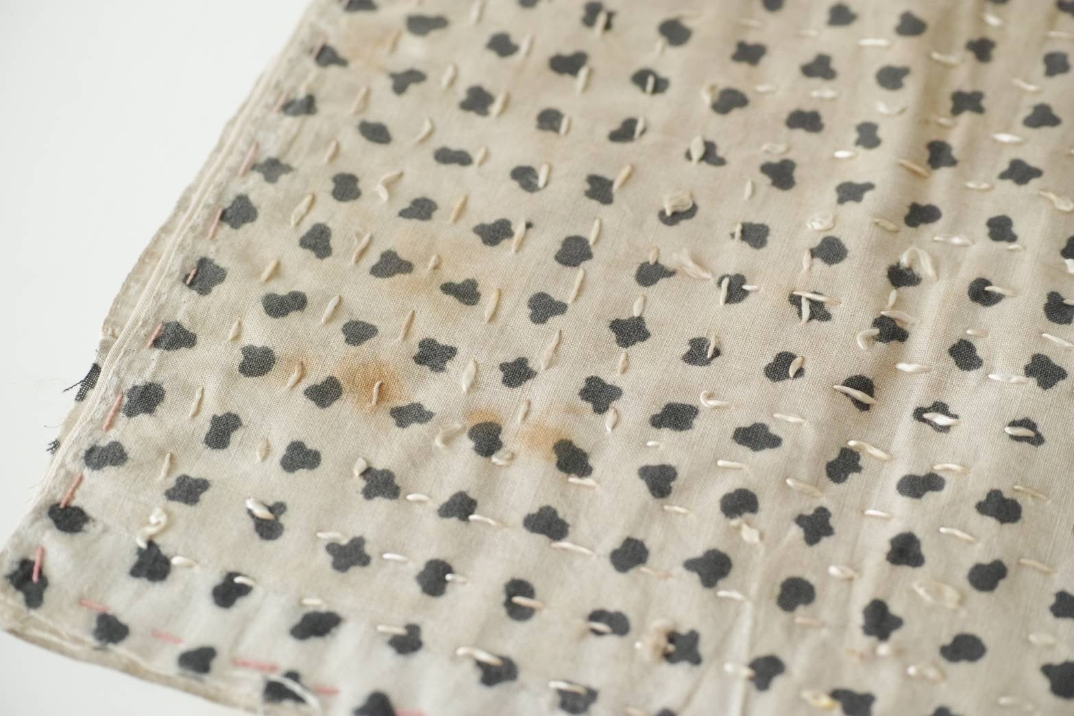 豆絞りで不規則なドット柄のある布をちくちくと。