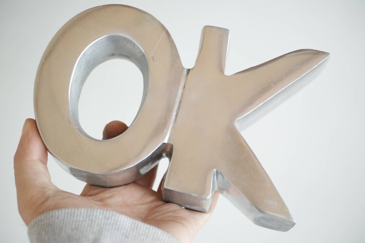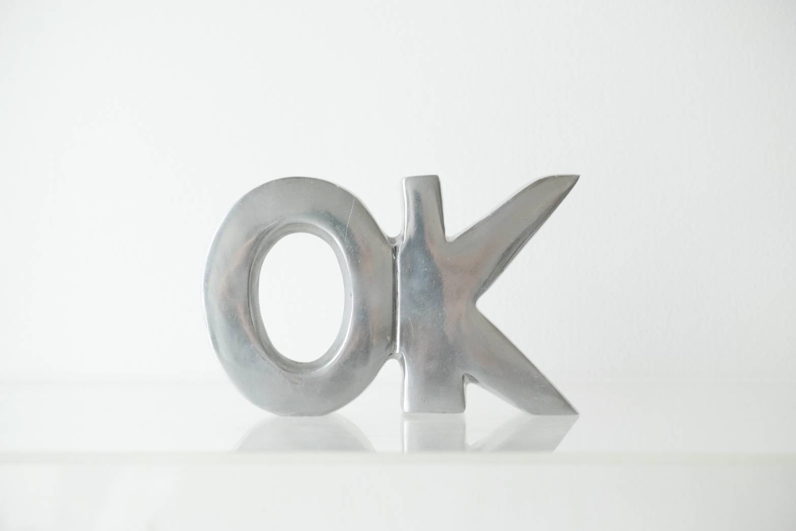 アルミの削り出しで作られたOKのオブジェ。
